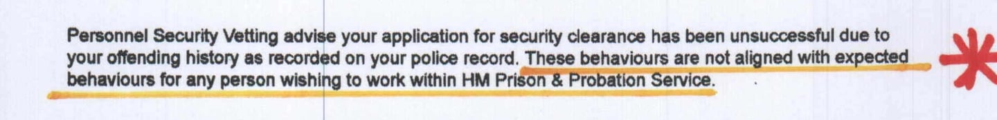 "These behaviors are not aligned with expected behaviors for any person wishing to work with HM Prison & Probation Service" (below)